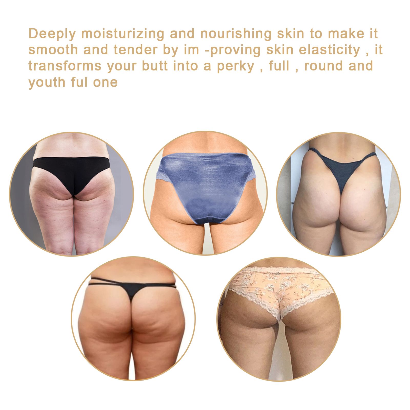 Our hip oil contains tocopherol (vitamin E) and safflower flower extract. It can deeply moisturize and nourish the skin, the elasticity of the skin, make the skin smooth and tender, and make your buttocks full of vitality, full, round and youthful. Its use method is very simple: 1. Apply appropriate amount on the skin; 2. Place palms on hips and gently massage; 3. Press down from waist to hips 10 times; 4. Wave 10 compressions from hips to thighs. rough skin, the firmness and elasticity of dehydrated skin, lift the buttocks and buttocks.