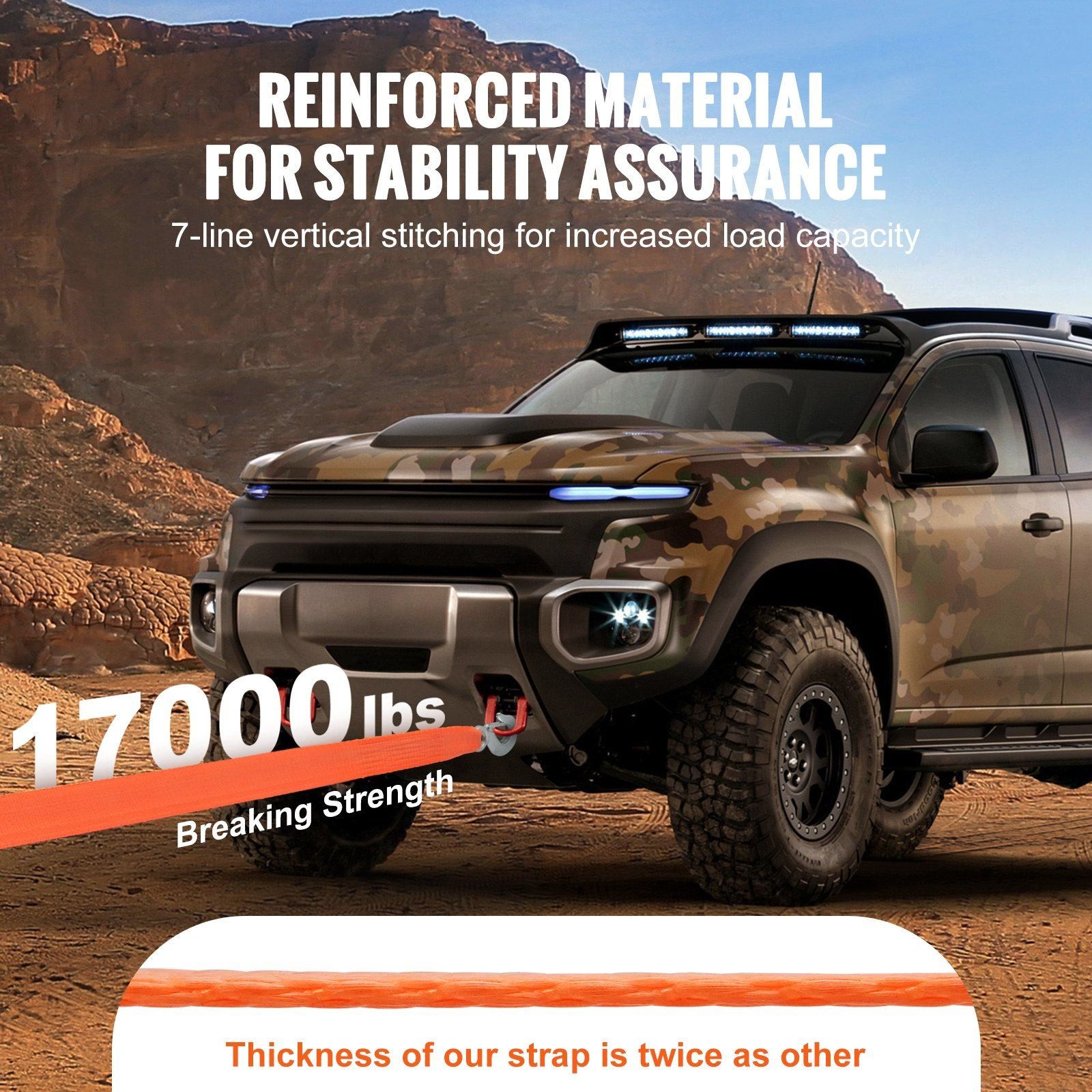 1.Heavy-Duty Vehicle Tow Strap: Our tow strap is a 2-inch wide, 20-foot long powerhouse boasting a robust 17,000 lbs capacity. With strong UV protection and top-notch durability, it's your trusty companion for pulling vehicles out of tight spots in extreme outdoor conditions, providing reliable rescue support.