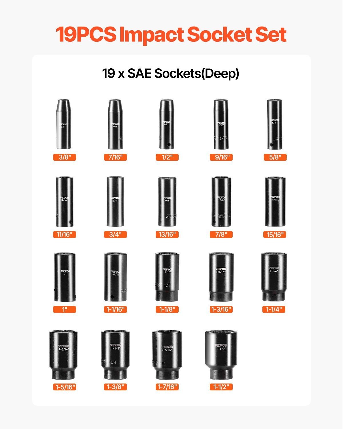 This effort-saving 1/2" drive deep impact socket set comes with 19 impact drive sockets: 3/8", 7/16", 1/2", 9/16", 5/8", 11/16", 3/4", 13/16", 7/8", 15/16 ", 1", 1-1/16", 1-1/8", 1-3/16", 1-1/4", 1-5/16", 1-3/8", 1-7/16", 1-1/2".