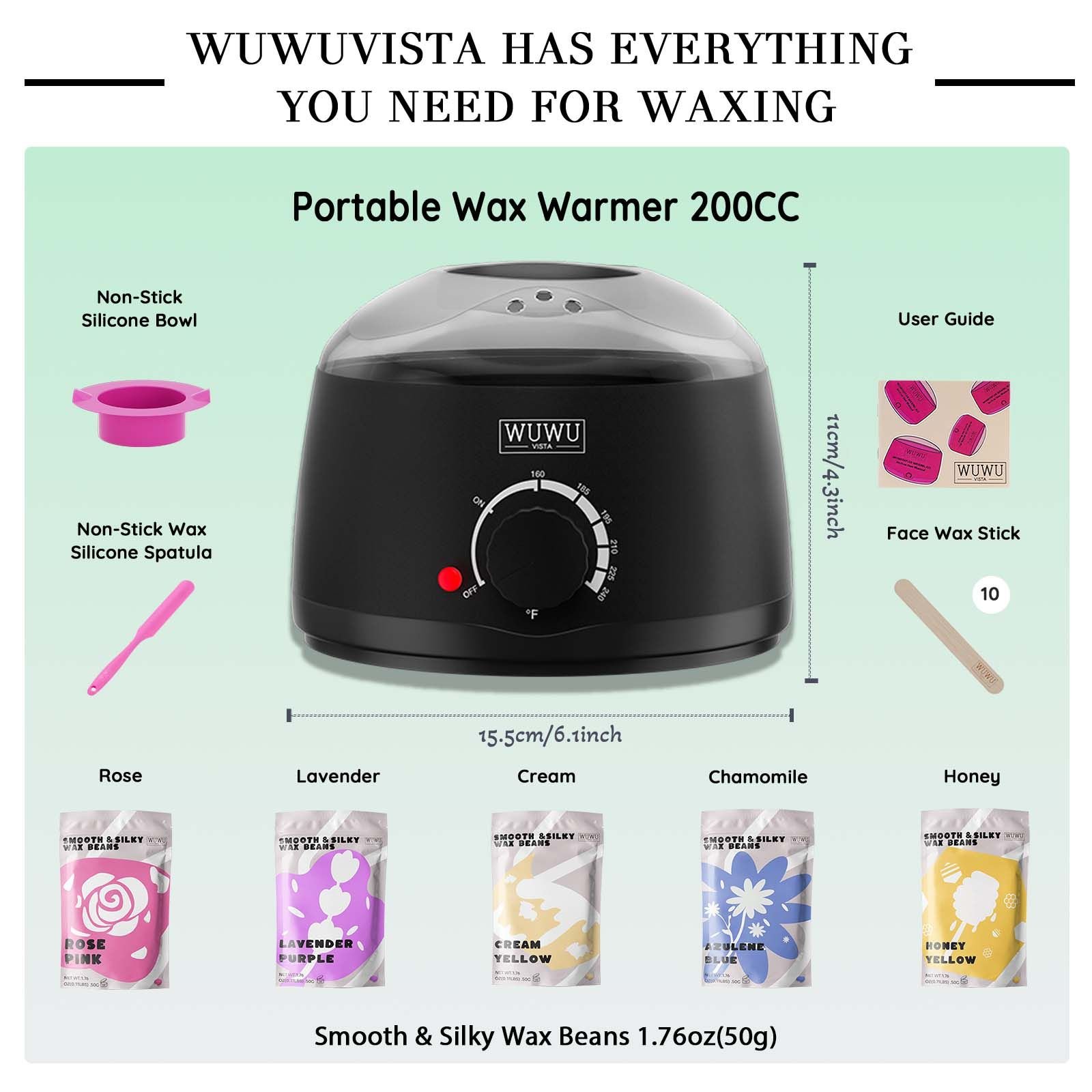 1.SIMPLE AND FUNCTIONAL HARD WAX SET: WUWUVISTA's Hard Wax Warmer Set comes with a total of 19 accessories including a wax warmer, 1.76 oz wax beans*5, a silicone bowl and spatula, facial wax stick*10 and a user guide. One kit for the whole process of hair removal!